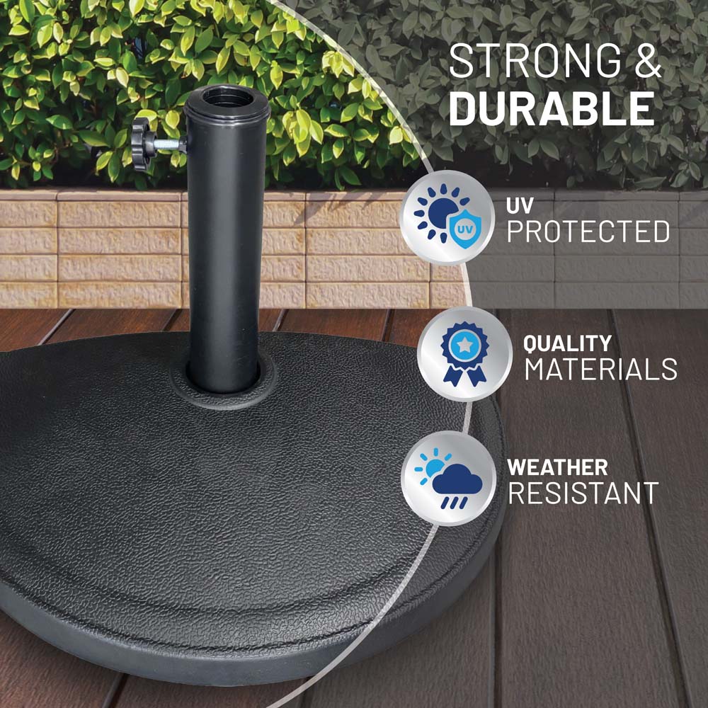 The US Weight Half Round Umbrella Base is the ideal choice for a deck, patio, balcony, or other outdoor space where a semi-circular umbrella is used. Manufactured using a durable composite resin to resist sun and weather, this stylish 20lb base works with half round umbrellas up to 9.5 ft and poles up to 1.9” diameter. The pebble-texture finish lends a modern look to any area and the 19.25” x 12.25” size provides good stability with a minimal footprint.
